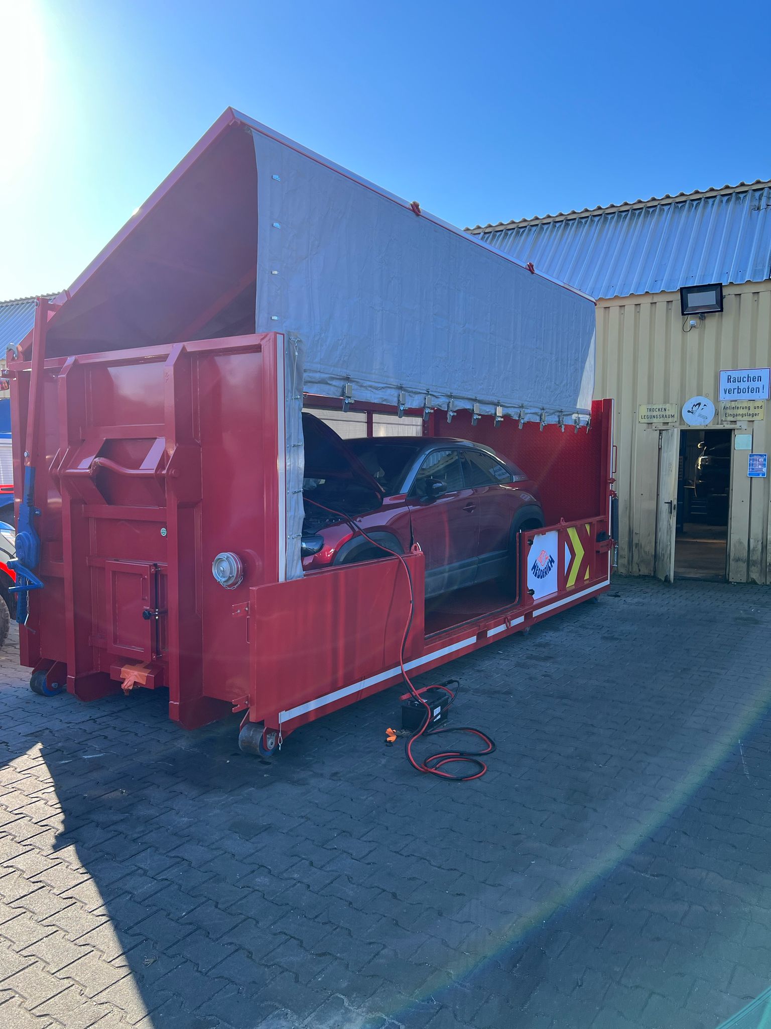Nach der Bergung erfolgt der Transport von Hochvolt-Fahrzeugen ausschließlich in speziell ausgerüsteten Sicherheitscontainern. Diese sogenannten FireBox- oder SafetyBox-Systeme bieten nicht nur mechanischen Schutz, sondern sind auch technisch vorbereitet für den Ernstfall.